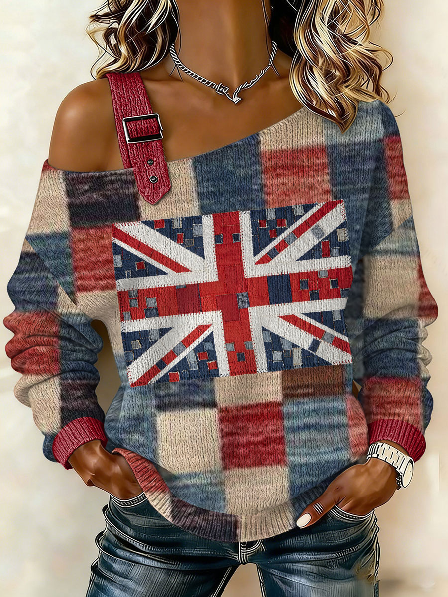 Women's Union Jack patchwork print Vintage Cat Patchwork Print Casual Off-Shoulder Sweatshirt